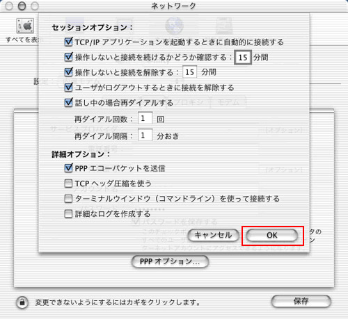 (1) 通常は[PPPを使用]を選択します。 (2) [return]キーで改行して、2行になるように入力します。 (3) 入力は不要です。 7. [ネットワーク]ウィンドウの[PPP]タブを設定し[PPPオプション...]ボタンをクリックします。