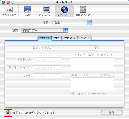 [ネットワーク]ボタンがない場合は[すべてを表示]ボタンをクリックして、画面下側に表示される一覧から[ネットワーク]アイコンをダブルクリックします。 3. [ネットワーク]のウィンドウが表示されます。ロックが掛かっている状態の時は、解除を行ないます。管理者以外のユーザーでログインした場合などに、設定を変更できないようにロックが掛かる事があります。ロックが掛かっているかは、画面左下の鍵マークのアイコンにて確認できます。