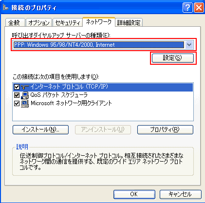 [LCP拡張を使う]:通常は、チェックを外します。 17. [インターネットプロトコル(TCP/IP)]を選択した状態で、[プロパティ]ボタンをクリックします。